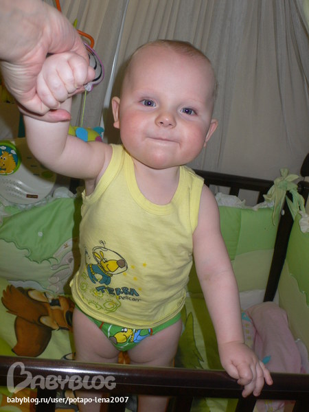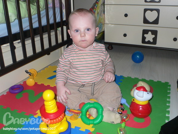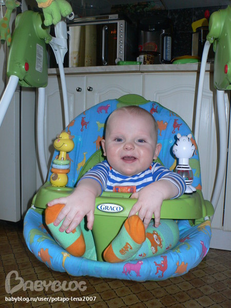 Макарушка заметно вырос и повзраслел. Умеет сидеть , но сам не садится. На кроватке , держась за перила может встать на коленки. Но назад....никак. Переворачивается исключительно за пультом или телефоном. Никакая игрушка не заставит его перевернуться на спину. Вот такой маленький ленивец. Бегает в ходунках со страшной скоростью, сбрасывая все на своем пути, открывает ящики на кухне и вытаскивает все, до чего дотянется. Любит неволяшку, перамидку, грызульки, погремушки, зеркало. Несколько фото 8 месяцев.