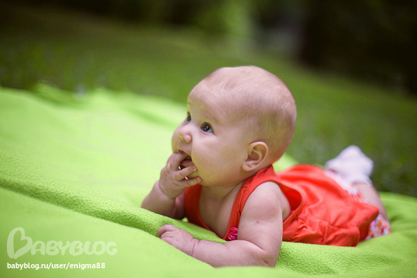 доча уже вовсю хохочет, переворачивается с 3 мес ловко со спины на живот, обратно еще не умеет, иногда высоко поднимает попку и типа ползет)) засыпает только на животе теперь и с пальцами во рту)