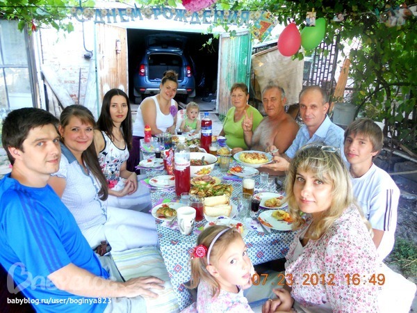 Дальше была куча поцелуев, обнимашек и тисканий моего котика))) Позже мы уехали к бабуле и купались в новом подаренном бассейне ....а тем временем......МЫ МЕДЛЕННО И УВЕРЕЕНО ТОПИЛИ СОСЕДЕЙ!!! Представьте мой ужас, когда нас наконец-то вызвонили!!! Но дорогие соседи, узнав, что у нас День варенья решили с нас денег за потоп не брать! За что им спасибо! Потом пока был сонный час мы с кумой украшали наш захудалый дворик :::: шарики, надпись С ДНЕМ РОЖДЕНИЯ, фотки развешенные на веревках и т.д. Угощения : шашлык, выловленная дедом и пожаренная рыбка, картошечка, овощи и безмайонезные салатики. А на сладенькое арбуз, дынька и конечно же наш торт, с любовью выпеченный моей кумой