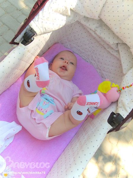 - изучила свои руки и начала осваивать ножки, все время пытается их захватить но не совсем получается, выскальзывают; может, поэтому не хочет переворачиваться, ведь и на спине есть чем заняться;