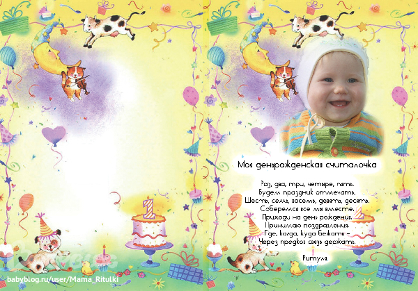 А еще хотела показать пригласительные. Возможно кому-то пригодится идея. Наше с мужем совместное творчество. С меня - идея, стишок,и контроль за выполнением. С мужа - дизайн. При печати нам правда краски пожалели, вышло бледновато, ну да ладно, все равно весело. Все пригласительные мы потом собрали на память Ритульке. Много чего хорошего там нам написали.