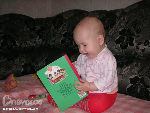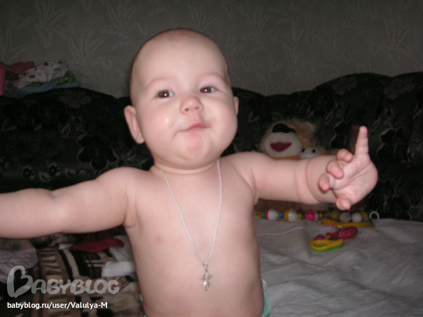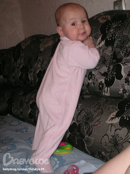 ХвастаемсяВот такие мы уже большущие!!! Как же быстро пробегает время! Этот месяц стал для нас месяцем переживаний и новых умелок. Мы почти две недели пролежали в больнице с бронхитом((( легли как только исполнилось полгода. Нашу попу искололи иголками и заставляли пить таблетки (это кстати о нашей медицине - в детском отделении нет сиропов от кашля, только таблетки...). Но в целом даже в больнице мы не унывали и постигали новые умения. Научились похорошему ползать и даже переползать через препятствия в виде подушек, подлокотников и пр. Научились сидеть, первый раз сама села ровно в полгода, а к 6,5 месяцам научилась это делать свободно, сейчас садится даже не задумываясь и сидит столько, сколько захочет, а не заваливается на бок как в первые попытки. Даже не научившись толком сидеть, дочка решила, что ей пора вставать, певые попытки (безуспешные, конечно) она совершила в больнице, цеплялясь за прутья кроватки (а глупая мама все думала, что она к ним лезет постоянно). Первый раз встать получилось, когда выписались в 6,5 месяцев, уже дома, дочка подобралась к подлокотнику дивана, оперлась на него ручками, встала на ножки и переместила руки на придвинутый к дивану стол, встав при этом в полный рост. Счастью ее не было предела, вообще она очень радовалась всем своим новым умелкам: получилось сесть - улыбка до ушей, встала - радостный визг, сейчас все это, конечно,не вызывает такую бурю эмоций. Теперь дочка встает, когда захочет, не могу сказать что совсем легко и свободно, но все же без особых проблем, встает на диване, держась за маму или папу, встает в манеже, в кроватке, около стула и т.д. Научились говорить первые слоги "ма-ма-ма" и "тя-тя-тя", иногда "да-да-да". Одевать дочку стало невозможно, она всегда удирает, особая беда перед прогулкой, когда памперс надо одеть! Купили дочке горшок, вчера "обновили", успели уже и посикать, и покакать туда (ну совсем как большая))) В питании появилась хоть небольшая, но все же разнообразность. Кроме маминой тити едим рисовую и гречневую кашу, кабачек, картошку, цветную капусту и брокколи, понемножку начали пить воду, иногда мне кажетсь правда, что не от жажды, а потому, что потом мама даст бутылочкой поиграть и можно будет соску покусать. Нравиться из кружки "пить" - в нее весело пузыри пускать, правда потом приходится переодеваться. Купаемся теперь сидя в ванной, научились хлопать по воде ладошками, любимая игрушка во время купания, это маленькое красное ведерко, почти не выпускаем его из рук. Ну и вес наш теперь 8900 гр, рост 71 см. Дальше фото-отчет: