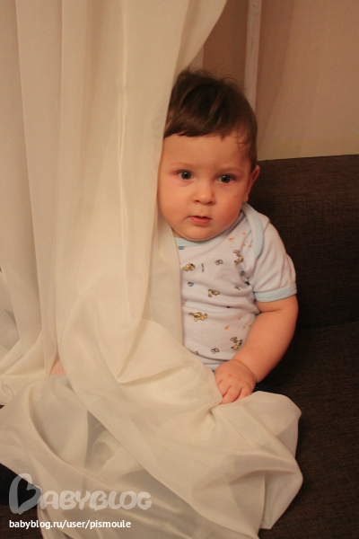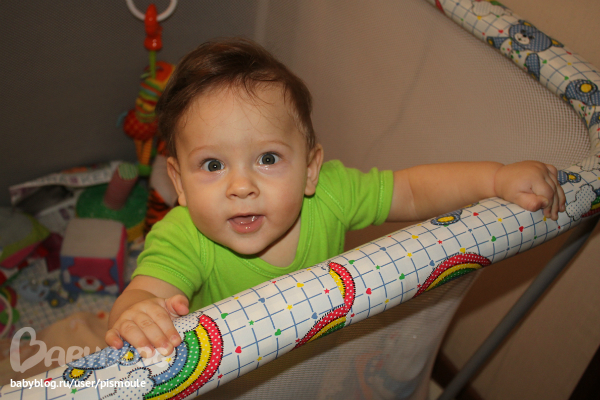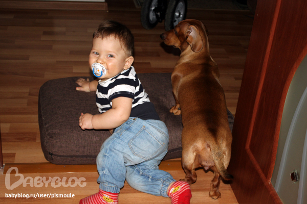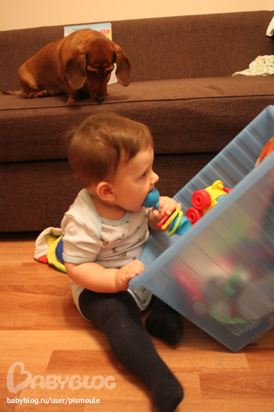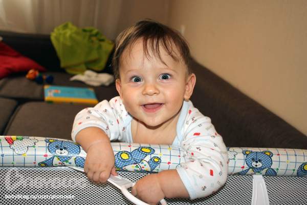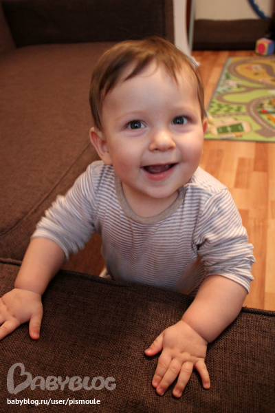 а теперь про умелки) ползать мы начали где-то в 7 месяцев и сейчас уже довольно шустро летаем по квартире, особенно за котом или собакой, уверенно сидим из любого положения, но сидеть уже не нравится особо, нравится стоять!!! одной рукой держится за опору, а другой хватает все, что не прибито и до чего может дотянуться. животные спасаются теперь только тем, что пытаются куда-то повыше забраться или спрятаться))) игрушки, которые все многочисленные родственники скупают в больших количествах, мы не любим, играем с пультом, маминым телефоном (если мама не успела его спрятать), папиными наушниками, различными кнопочками на технике. а еще у нас очень вкусные ботинки, а когда совсем станет скучно, то можно отправиться за собачими игрушками, тут и собака сразу же прибежит, вместе веселее играть))) еще очень любим играть в "ку-ку", это когда Денис прячется за шторой, а мама его ищет) из говорилок у нас пока только "а!" и "грррррррррр", но будем стараться в этом направлении.
