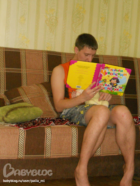Папа иногда нам читает книжки)))(Она не сидит!!!Это она лежит так.)