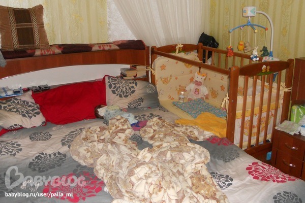 Спит в кроватке))Если это так можно назвать)))Кроватка вот так стоит