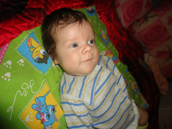 Так вот на сегодняшний день нашему Тёмочке 2 месяца 10 дней!!! он активно развивается и растет!!!! в 2 месяца мы весели 5700, прибавка за месяц составила 1700г. (для сравнения в первый месяц набрали- 700г.), а рост у нашего хомячка 59 см, каждый месяц прибавляем по 3см, но я сомневаюсь в этих цыфрах, а до сантиметра никак не дойду!!! Проходили всех врачей, все хорошо, кроме неврологии, пошли на платный прием к неврологу- она его смотрела, крутила, ставила, сделала узи, в конце концов одела нам воротничек- говорит кривошея (бедный наш малыш искричался весь, пока не сняли, потом у нас давление черепное т.к. малый родничек плохо зарастает, тонус в ножках (прописала массаж и электрофарез) и на то что я сказала, что и ногда собирает глазки в кучку, поставила диагноз- косоглазие, но нам она об этом не сказала, просто записала в карточку. В общем выписала кучу таблеток еще!!! Мы с мужем конечно очень расстроились и были в шоке от того кол-ва таблеток, которые нам нужно дать нашей крохе, в общем решили мы поехать в НИИАП Ростова и проконсультироваться с еще одним врачем. Приехали, она его тоже крутила вертела, почитала карточку и лечение, и сказала, что воротничек носят только до 2х месяцев, пока малыш еще не держит голову, после он нам нечем не поможет и вообще сказала, что кривошеи у нас нет, касаглазие- такой диагноз до 6ти месяцев нельзя ставить,т.к, у них еще не сформировалось зрение (как-то так, пишу как поняла), наножки ставила, а он пальчики подгибает и не разгибает, ну поставила какой-то диагноз, и тонус вроде,ну сказала поделаете массаж и электрофорез - пройдет!!!!! и конечно сделали мы УЗИ мозга, есть у нас давление, прописала нам Циннаризин и глицин. Говорит малыш развивается хорошо!!!!!! в общем мы остались давольны!!!! теерь пьем таблеточки, на массаж записались!!!!! Вот так!!