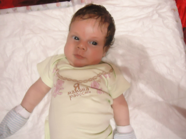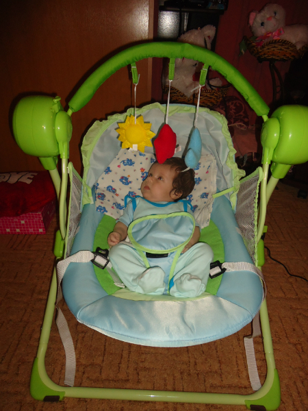 Интересуется игрушками, берет в ручки, но не на долго, вся старается попробывать на вкус- очень любит свой кулак, (слюни постоянно текут) любит что бы на ручках поносили и именно столбиком и не как по другому, на качелки катается и одновременно играет с погремушкой и слушает музыку!! А еще красиво улыбается и агукает- гы га агу кы а, и т.д. Ходим каждый день гулять, на воздухе сладко спит, любит купаться, но не любит вылазить из ванны))) бЕЗУМНО СЧАСТЛИВЫ, ЧТО НАС ТЕПЕРЬ ТРОЕ!!!!пытаемся наслодиться каждей менуткой, проведенной вместе с нашем маленьким солнышком))) Вот так, кажется нечего не забыла, а дальше наше фото!!!