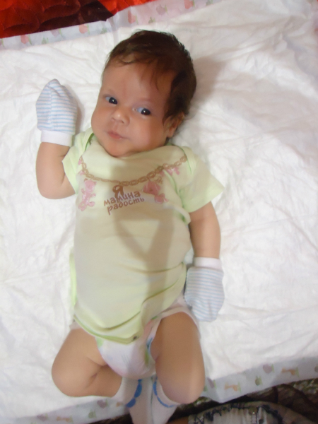 ! А вообще мы уже умеем держать головку, но я все же поддерживаю ее, иногда она у нас падает, нравится ему становиться на ножки, пытается ими отталкиваться, не любит долго на животике лежать, но лежа, поднимает высоко голову и грудь, за-то любит у папочке на пузике полежать! Кушаем много, каждые часа 2-2,5, но по 90-120г, какаем плохо, точнее пока только со свечкой, но всячески пытаюсь лечить, надеюсь скоро сам начнет!!!