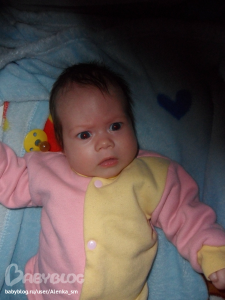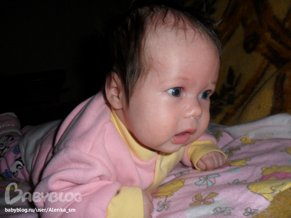 Любит проводить время на пузе, но не просто торчит как на фото, а пытается ползти) Прям с таким усердием) Подставляешь ей под стопы руку свою в качестве опоры - отталкивается, руками загребает)) Дистанцию в полтора метра преодолевает таким макаром! Нравится ей очень. Улыбается всем во весь беззубый рот) Так прикольно) Голову довольно таки неплохо держит. Купаться любит очень, особенно когда на голову сверху ей поливаем - рот откроет и пить пытается) К двум месяцам начала тянуться за игрушками, а еще любит папу гладить по лицу, точнее по щетине, смеется) Ночью спит хорошо, укладываем около 12 до 6-7 часов беспробудно дрыхнет, поест и опять до 9 спит, пока папа перед уходом на работу не переложит ее с детской кроватки в нашу, ко мне под бочок и так спим с ней до 12) Счастье!! А вот днем когда как хочет - спит, не хочет - так целый день может бодрствовать. Вот такая у нас с мужем принцесска растет. Я довольная)