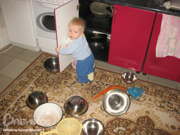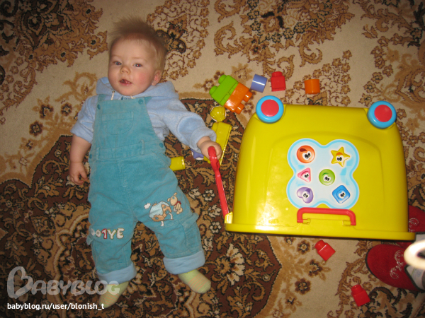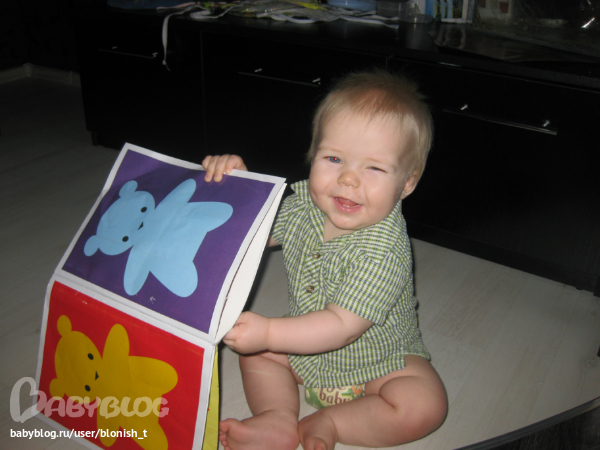 5. смотрим книжки школы семи гномов, вообще ничего не знает))))) зато научился страницы листать, процесс этот нравится... умных умелок по-прежнему нет... поднимает руки вслед за мной на вопрос "какой Кирюша большой?" и еще у двух игрущечных котиков знает где нос.... остальные животные/люди такой чести не удостоены....Очень любит в прятки играть, искать меня, когда его зову и прячусь где-нибудь...