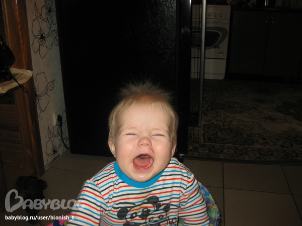 показательный плач (под носом первая серъезная травма - завалился между лестницей и горшком цветочным, ободрал кожу немного)