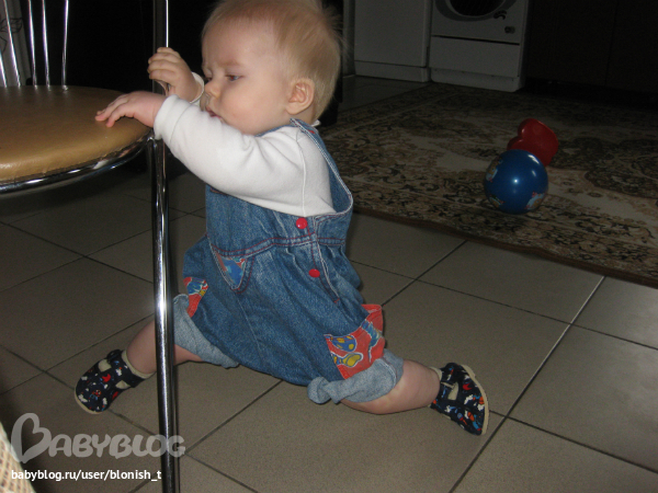 4. встает, ходит вдоль всего, за одну руку и даже можно уговорить протопать пару человеческих шагов, но добровольно по собственной инициативе пока не пошел...