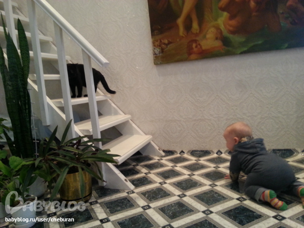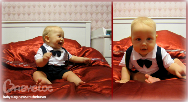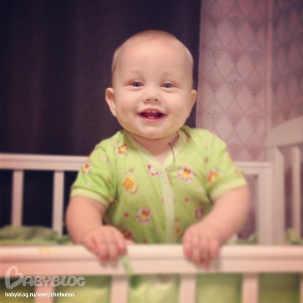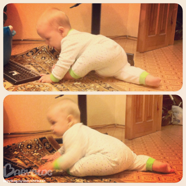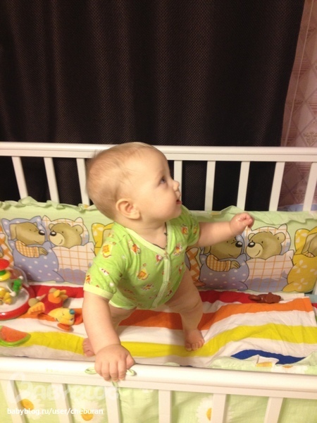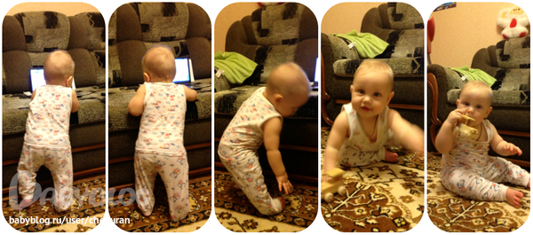 Сидит уверенно, садится из любого положения. Ползает как метеор. Обожает переползать препятствия. Встает у опоры иногда переступает пару шагов вдоль. Стоя может отпустить одну руку, за чем нибудь тянуться.