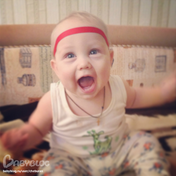 Лёва очень веселый мальчик, постоянно хохочет, улыбается))) Любит играть в ку-ку, кататься на папиной шее, смотреть Машу и медведя (как загипнотизированный, я ему в это время ногти стригу).