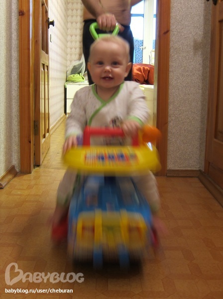 Любит стул на колесах, сядет около него и катает туда-сюда. Начали интересовать машинки, играет с ними.