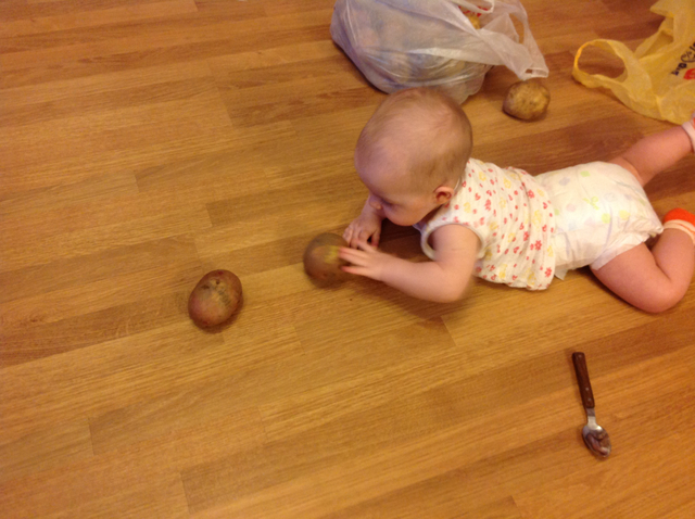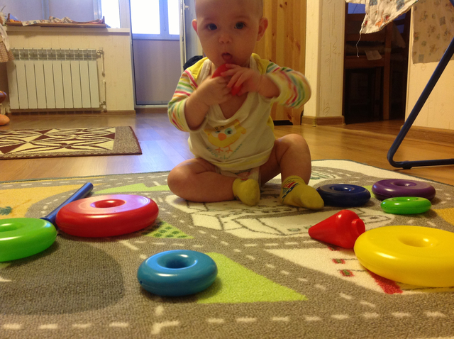 Катюша умеет к 6 месяцам: крутится вокруг своей оси, шустро ползти назад, садится, встает у опоры. Умеет отодвигать что то мешающее ей увидеть: занавеку в ванной, пеленку, за которой мама прячется и тд. Подбирает мелкие детали