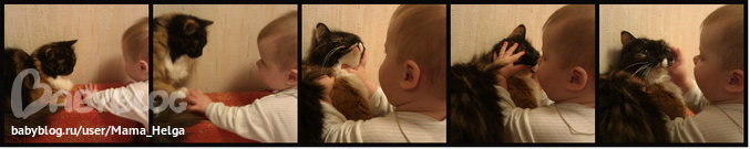 Наш киса тоже лежит и терпит если малыш до него добирается правда пока перекатыванием через бок и по червячьи))) а кошки все понимают и если бы им не хотелось уходили бы))))