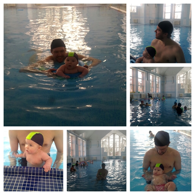 Бассейн и водные процедурыМы начали нырять и плавать дома в ванне почти с самого рождения, а вот в бассейн начали ходить почти в 4 месяца, и то только раз в неделю. Алисун в бассейне всегда вела себя очень настороженно, но явного неудовольствия не проявляла. А вчера произошел рывок или скачок: сама ныряла с бортика пару раз, сама плавала на пенопластовой штуковине за мячиком и к папе, смеялась и всячески радовалась, и кажется даже не хотела домой идти;-)