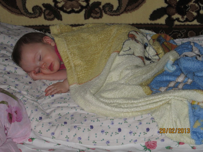 Спим, по прежнему, два раза в день, утром (в 9-10) вместе со мной часа два и на улице (после трёх) тоже часа два. Отбой в 21, просыпается с 7 до 8, ночью к сисе просыпается постоянно, поэтому часа в два или три, ложусь спать и её забираю к нам.... причём Валюшка сразу поворачивается ко мне спиной и спит до самого утра, наверное чувствует, что я рядом))))