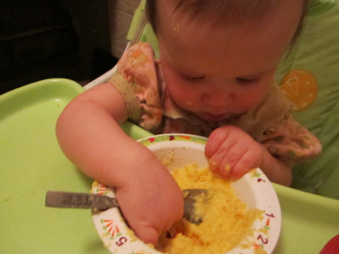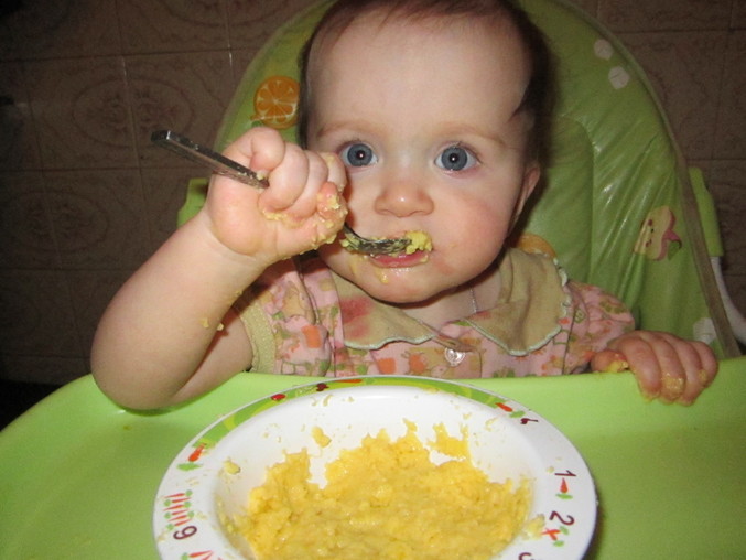 ХвастаемсяРешила я приучать дочу кушать без моей помощи, думаю может через несколько месяцев научится))) Хоть она и раньше всегда ела только при условии, что у неё в руке тоже ложка будет, которой она будет стучать по столику. Но на этой неделе решила, что пора оставлять Валюшку один на один с тарелкой, естественно после того, как я накормлю)))) Пусть делает, что хочет, правда приходится мыть по несколько раз на день, но пусть учится))) И вот сегодня она съела самостоятельно много, ложек пять шесть наверное))) Конечно вся перемазалась, но столько у неё усердия и радости было)))) Моя куколка освоила новую умелку