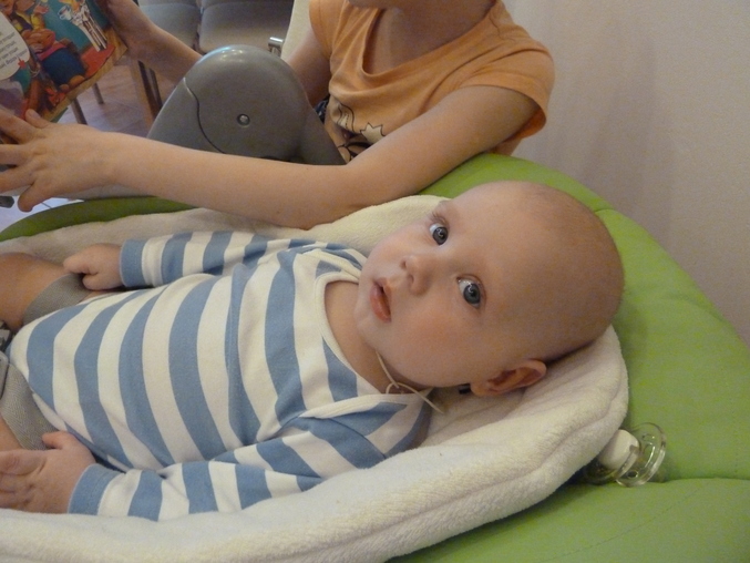 За этот месяц Гошка научился переворачиваться с живота на спину, ползать по чапайски, показывать язык, вижжать (визгом выражаются различные эмоции), играться с соской, вытаскивая ее туда сюда за кольцо.