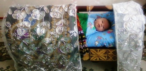 Поэтому чтобы не дразнить духов смерти и болезни, младенца подвешивают вертикально, в специальной подвесной колыбели из ткани, разумеется, полностью фиксируя голову и тело малыша. Женщины, родившие ребенка, первые 40 дней также должны находиться только в вертикальном или сидячем положении.