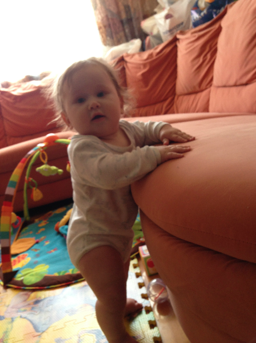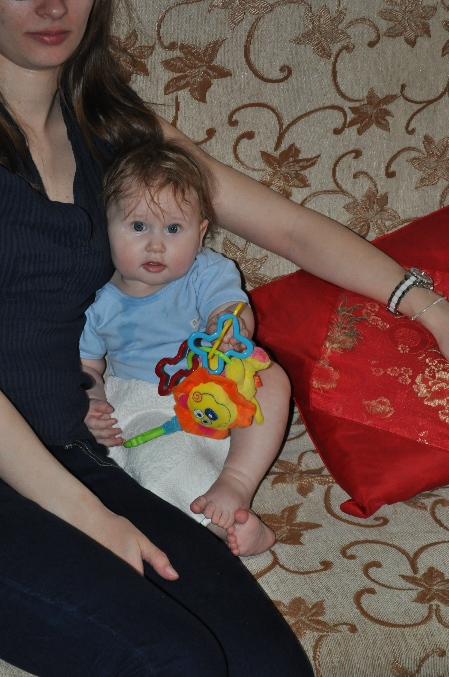 Еще подползает, цепляется за одежду и подпрыгивая встает на коленочки выпрямляя спину и руки. С коленок пытается встать, ставит одну ножку на ступню, пытается поставить вторую, но начинает скользить. При небольшой помощи встает на ножки.