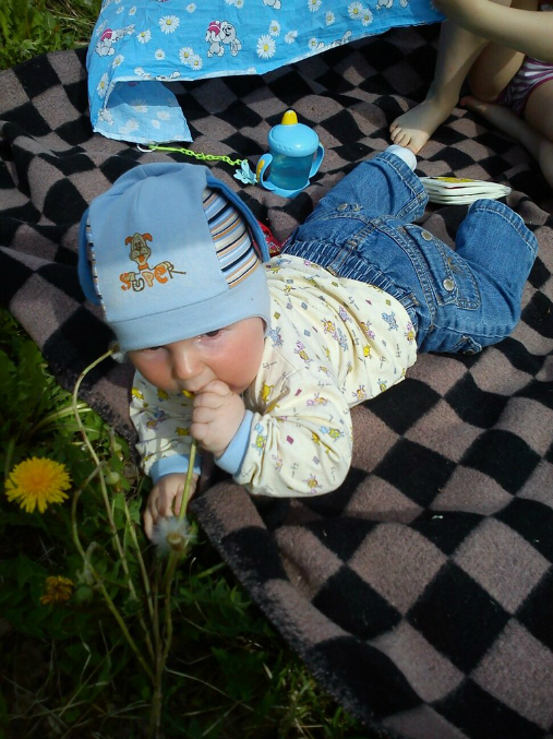 На прогулкеВ наш город пришло лето!!!! правда ветер был сильный. Андрей не мог уснуть весь день. Было не до сна, ведь покруг так много интересного!!! Ползали по травке, пробовали одуванчики на вкус...