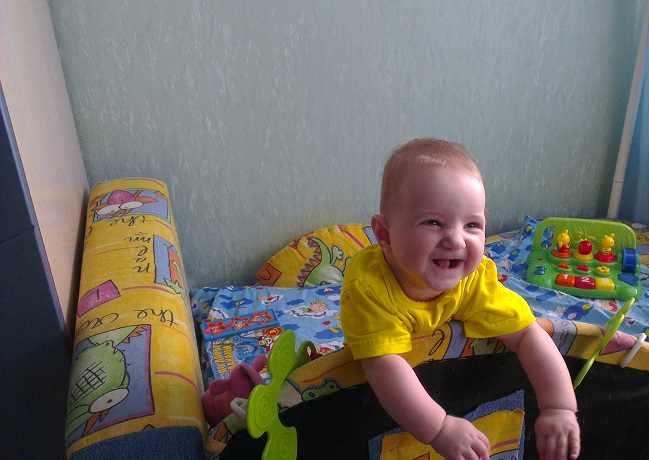 Наша Дарья тоже рано стала вставать на ножки, в 6 с половиной месяцев. У меня был и восторг и шок одновременно!!! Лежа на полу она вставала за диван, а держатся еще не понимала, падала. Я стелила толстое одеяло, ну и без присмотра конечно не оставить было.    Ручки такие класные, пухляшки!!!