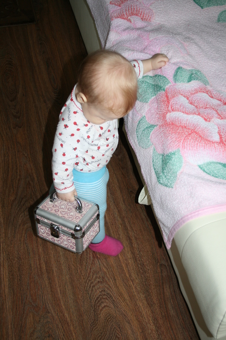 Саша ходит вдоль дивана, стаскивает с него все, до чего дотянуться может)) В чемоданчике мы храним резиночки, заколочки)) Что то я там перебирала, оставила на диване, Саша естественно стянула его)