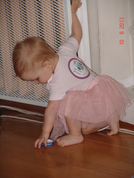 Она и сама теперь не готова постоянно сидеть или лежать у меня на руках. Теперь она самостоятельная личность! :) Она бегает, лазает везде, где только можно и нельзя. Она обожает играть в догонялки. Она жутко любит детей на детских площадках, особенно тех кто пошумнее и постарше. Она просто обожает свою старшую сестру, особенно танцевать с ней. Она такая хитрушка, что научилась прятать игрушки и маркеры под диван! :) Она ловко слезает и залезает на диван, а теперь и не только на диван, но и на все лестницы и прочие возвышения. Она уже даже не очень-то хочет кушать детскую еду. А вот из маминой тарелки она готвоа кушать все. По крайне мере пробовать точно. И это, кстати, дисциплинирует маму в выборе еды и почти полном отказе от соли :) Марусель собирает пирамидки, ставит кубики друг надруга, нажимает все кнопки как положено. Включает и выключает телевизор, без нашего согласия естественно. Знает как надо пальчиками двигать все на iPhone и iPad. Обожает общаться по Skype :) Пытается рисовать и лепить. Говорить слова на привычном нам языке не торопится, но на своем похожем на инопланетный болтает без умолку :)