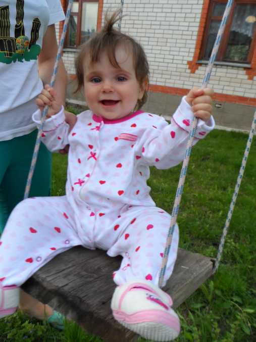 На качелке! Еще кстати здесь не стриженая)) А так стригли ее уже 2 раза!