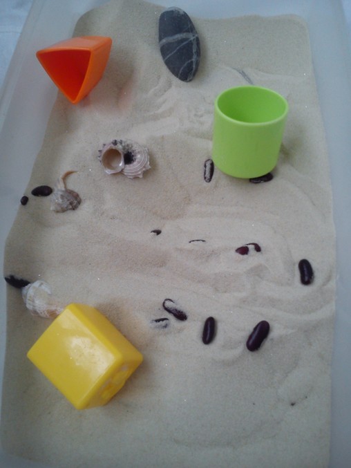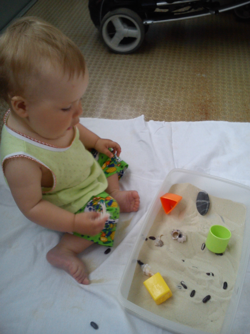 Пригодилась пластиковая емкость (удобнее плоская), ракушки, кораллы и камушки, привезенные с моря, фасоль, формочки (у них есть дырочки, через которые песок высыпается тонкими струйками, а Уля его "ловит"). В общем, пригодится всякая мелочевка, которую можно прятать в песке и искать.