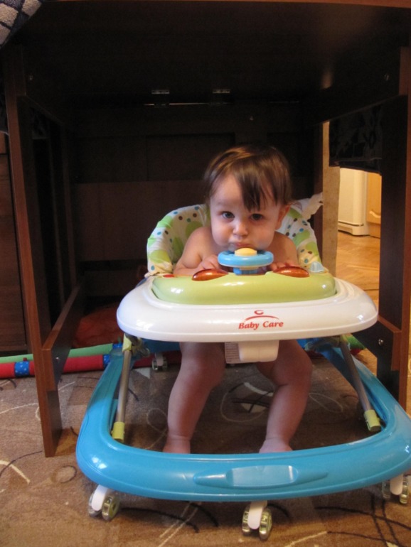 Ну вообщем так у нас целый день. Я сынулю постоянно где-нибудь вылавливаю.На секунду отвернусь, а он уже чем нибудь опасным занят))). Чтобы убрать в квартире или приготовить поесть, приходится парня либо в ходунки сажать (но тогда тоже надо присматривать - он на них к столику еще быстрее добирается) , либо под "кроватный" арест брать. но там он терпит минут 15 от силы)))))