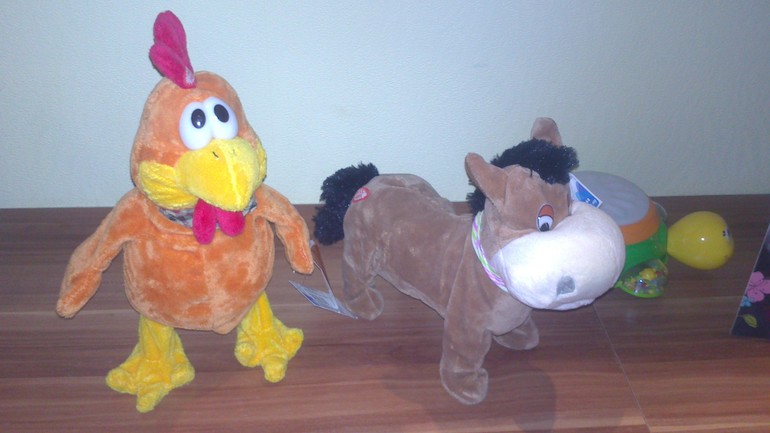 Вот) Вобщем лошадка ходит,виляет бедрами и поет. А петух танцует и тоже громко поет по-петушачьи))) а еще если взять за макушку петуха и поднять,То он начинает визжать кукарекать)))