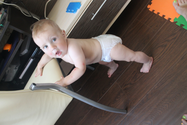 кушаем за троих.Мы отлично сидим и хорошо ползаем, довольно уверенно встаем у опоры на ножки, переворачивается с живота на спину и обратно. А еще мы делаем попытки переставлять ножки, держась за диван. Может самостоятельно встать на коленки и прыгаем на них :) Еще у нас вылезло 2 зуба, ждем следующие.