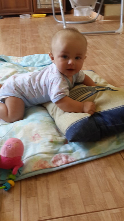 Стоим на четвереньках, ползаем на пузе, стоим на коленках, придерживать за что-нибудь. Очень любим взбираться на подушки, маму, папу. Не ищу легких путей. Сходим с ума по пультом от телевизоров, телефонов и проводов. К игрушкам равнодушен, практически. Любим кататься в машине. Более сносно сидим в коляске(аллилуя). Очень ручной и крайне любопытный. Слюни мы еще те, только слюни наши не зубные пока. Просто слюни и просто их очень много. Визжит и мычит постоянно. Очень филлигранно плюется и делает "бррр". Наши ручки - это "ручки- липучки". К ним постоянно что-то липнет. Мама устала уже это все "отлипать". А еще, как раз на свою дату, мы обзавелись соплями. То ли вирус, то ли сплит помог. Не понятно.