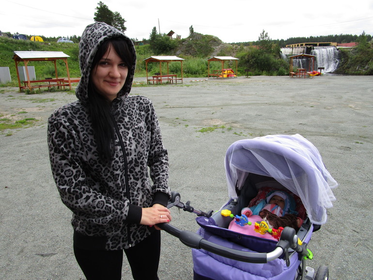 До места (искусственный водопад у нас в области) добирались около часа, большую часть которого Эля благополучно проспала. Когда приехали, все оказалось совсем не так радужно как мы себе представляли. С тех пор, как мы были там последний раз, это место уже успели огородить, разровнять площадку перед водопадом, засыпать ее всю щебенкой и наставить кучу беседок по кругу. И конечно же, брать за все это плату. Ну что ж, раз приехали, будем довольствавоться тем что есть. Быстренько разбили палатки, накрыли на стол. Элина все это время сидела в коляске и рассматривала все вокруг.