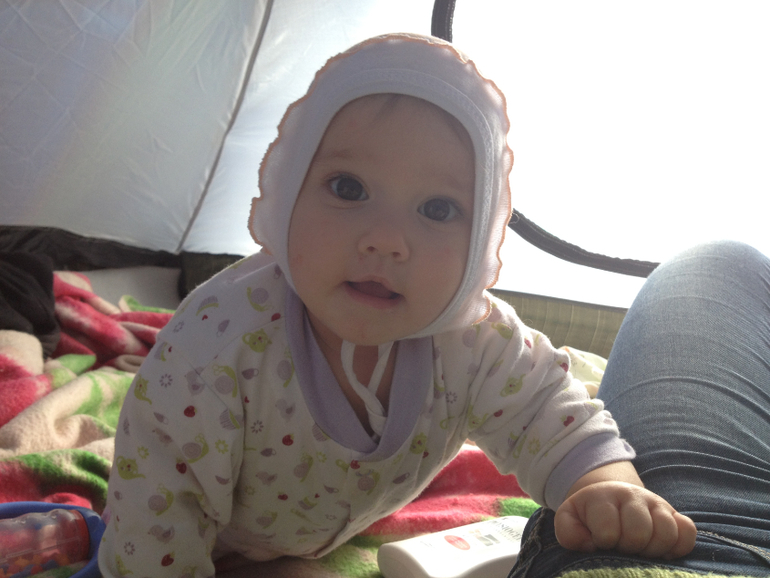 Эля проявила себя молодцом - не хныкала, не капризничала, спать ложилась вовремя и спала как месячный младенец. Первая ночь в палатке тоже прошла хорошо. Единственное что было неудобно, Эля очень не любит спать под одеялом и постоянно раскрывается. А так как ночью в палатке без одеяла было, мягко скажем, не очень комфортно, мне приходилось очень часто просыпаться и ее накрывать. Выспаться мне не удалось совершенно)