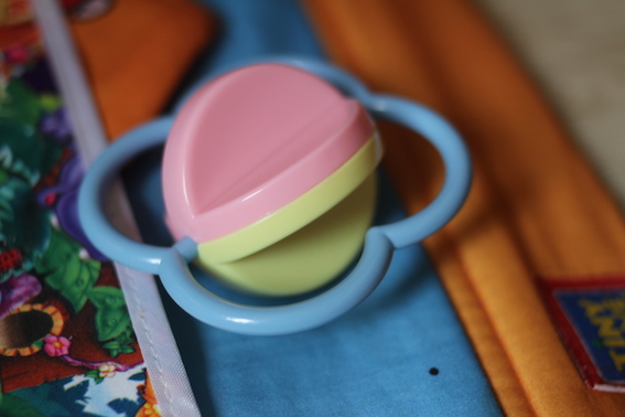 Вот эта погремушка оказалась перед ее лицом, когда она перевернулась на бок, а из-за недостаточно хорошей координации и слабых шейных мышц после нескольких минут держания головы она почти всегда ее резко роняет вниз. Вот тут и оказалась несчастная погремуха...Элли с высоты всех своих 8-10 сантиметров лбом налетела на ее край...