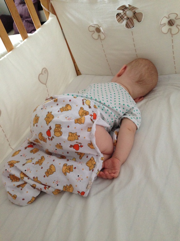 Поздравляем! Мы тоже так спим смешно попой кверху и головой в бортик. Пытаюсь перетащить, а она опять также укладывается...