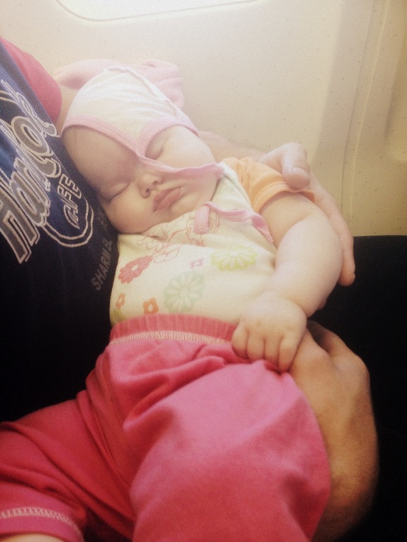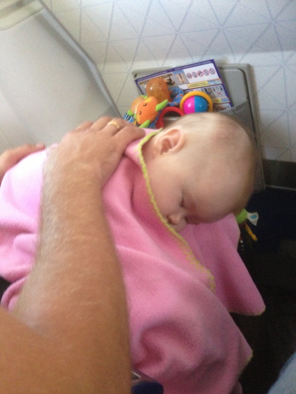 Перед полетом мы промыли Рите нос аквамарисом, воспользовались аспиратором и прошли зону досмотра. Перед этим я замотала Риту в слинг, потому что надеялась, что можно будет часть полета так провести, но в самолете попросили размотаться и пристегнуть Риту детским ремнем. Как только самолет поехал, мы закапали Рите в нос виброцил, а в ушки отипакс. во время взлета Рита мгновенно заснула и проспала 3 с половиной часа до самой посадки.