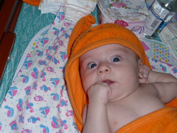 Итак, что мы умеем? Переворачиваемся со спины на бочок и обратно, ночью вертимся в кроватке по часовой стрелке. В положении полусидя пытаемся сесть. Любим купаться с кругом. Любим на ручках, особенно у мамы. Особенно столбиком. Особенно облизывать мамино плечо