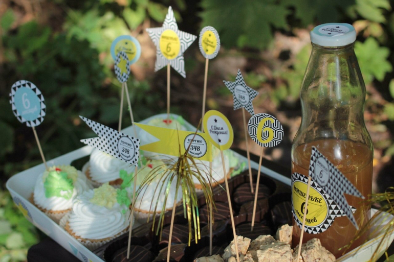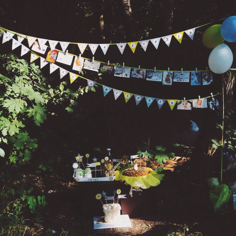 К полугодию я готовилась особенно тщательно, у нас на начало сентября выпало аж 3 праздника: 4 сентября полгода Мише и 29 лет мужу, 5-го сентября 3 года со дня свадьбы, а также в начале сентября мы отмечали 9 лет и месяц со дня знакомства и 5 лет как мы вместе)) я подготовила декорации, а свекровь напекла сладостей, мы с мужем сделали тазик оливье))) праздник был без темы, просто в определенных цветах: голубой , желтый и белый. Отмечали в парке, из детей был Миша и две трехлетки, они были просто в восторге от декораций и шариков)