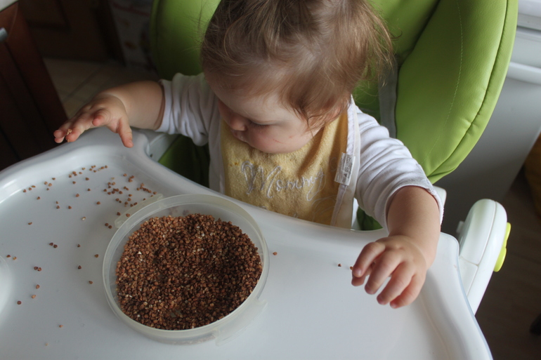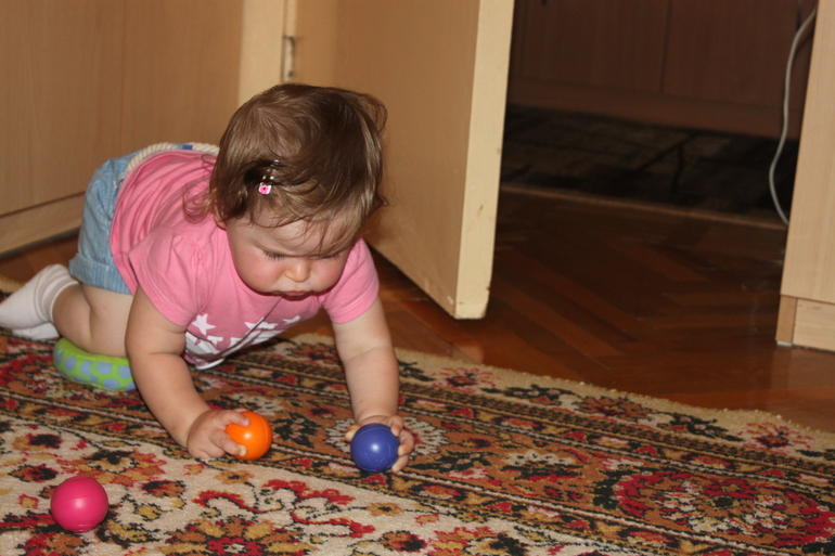 Ходили в гости к моей подружке у нее тоже дочка (разница с Анютой в 1 день), очень стало нравится играть с другими детками. Катать мячик, давать что то.