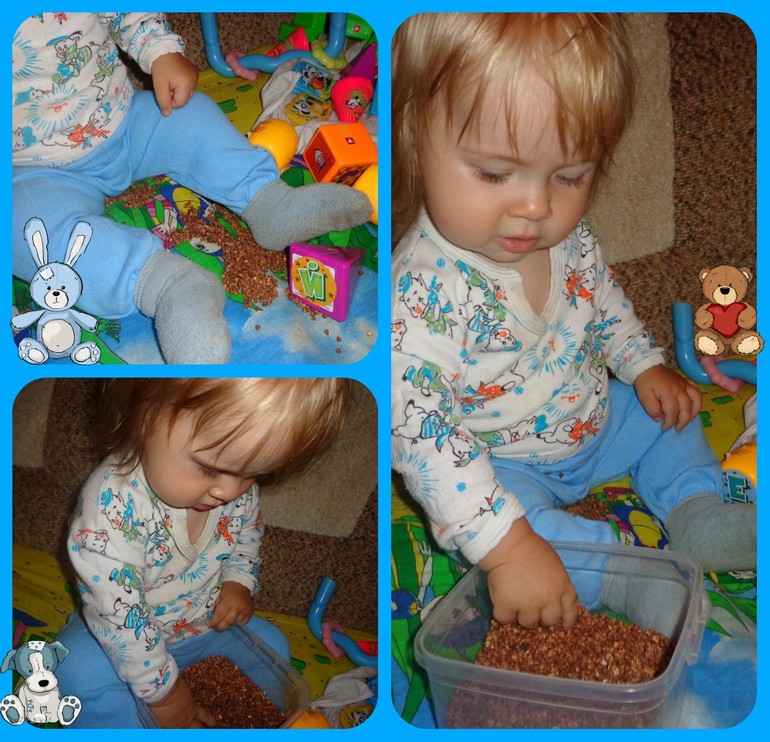 Не поверишь, но вчера впервые дала Саше контейнер с фасолью, все переживала что будет в рот тянуть, и была на стреме, но почему-то моему сыну очень понравилось набирать в руку фасоль и подкидывать, в итоге сын спать, а я выгребать фасолинки, пока думаю не будем в крупы играть. У меня есть металическая коробка из под конфет, я в нее всякие мелочи сложила (шишка, расческа, деревянные шарик и палочки, разные колечки и т.п) и когда мне надо 15мин покоя даю ему коробку)) главное периодически пополнять ассортимент)