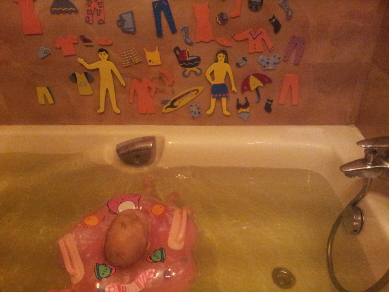 Купает нас всегда папа. Купаемся по 30 минут, ей безумно нравиться, особенно качаться на волнах, которые папа создает. Больше всего плавает на животике.
