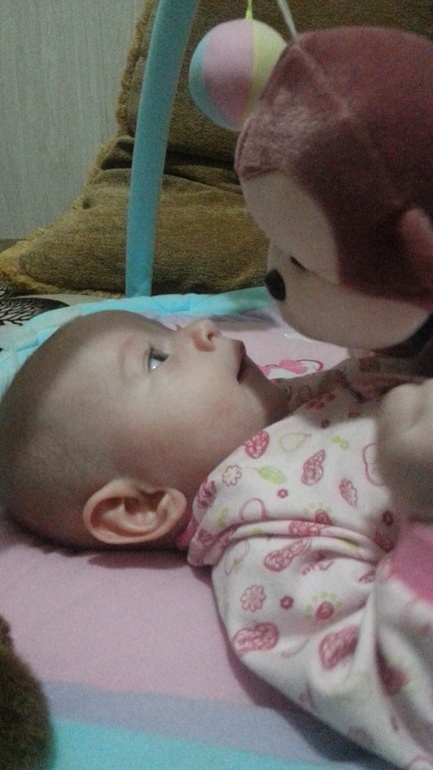 Переворачиваться мы так и не научились. Ищу хорошего массажиста, чтоб провести курс массажа, вдруг поможет. Зато мы пытаемся сесть!)) И очень обижаемся, если нам в этом деле не помогают - не потягивают за ручки)) Очень болтливы, любим магнитик на холодильнике с изображением хомяка, мобиль и телевизор. А так же процесс смены памперсов)))