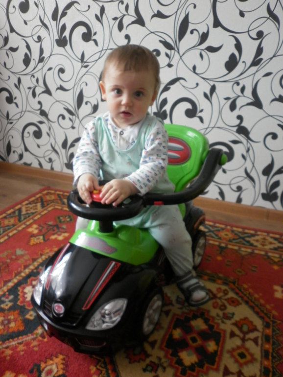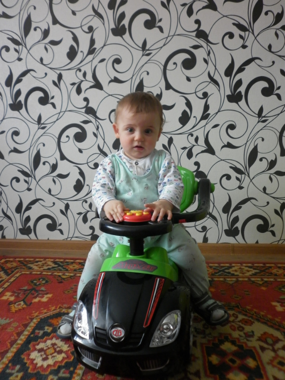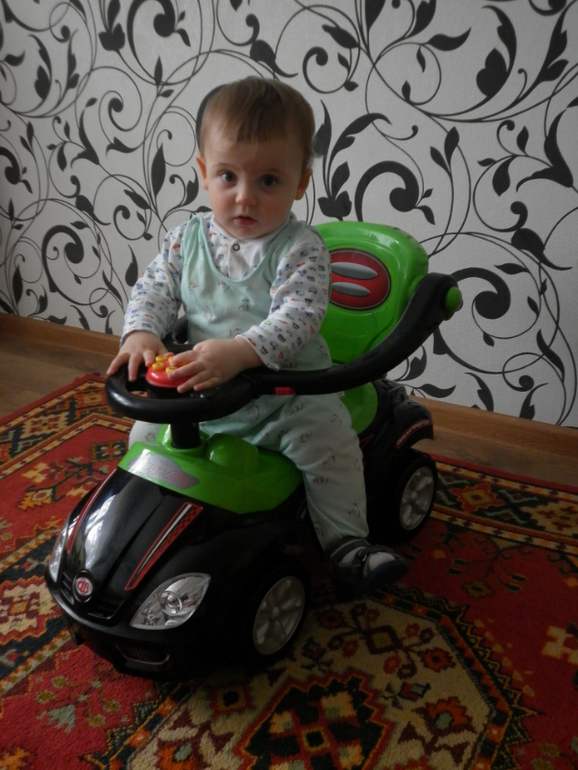 Ездит уже? У нас ноги только буквально сегодня доставать до пола начали. Через месяцок будет гонять, углы сшибать.