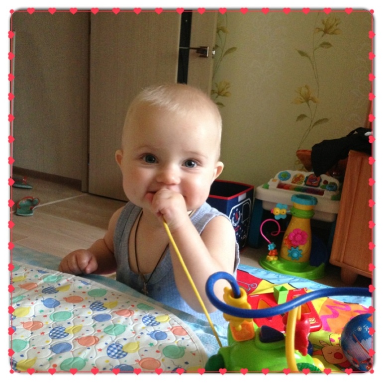 Весим 9кг рост 77см! У нас два зуба, четыре на подходе. Слюни просто льются, грызет все что поподаетсч под руку!